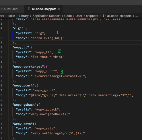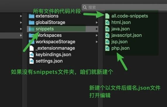下面附上我常用的粗陋的代码糖块文件all.code-snippets(可以直接复制使用,你可以自行自己添加删除。里面有自己写的java框架常用的代码块,php常用和html常用以及nginx比较常用的,个人习惯不一样建议全部干掉重来,只需按里面的格式来写就可以了,格式如下: