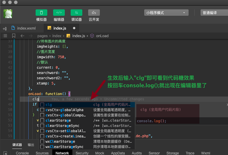 格式如上面,1,2,3是我比较常用的代码糖,生效后输入图1里面的clg回车就是console.log()(可以用这个来检测你代码糖功能是否生效);并且光标自动定位到()里,如下图: