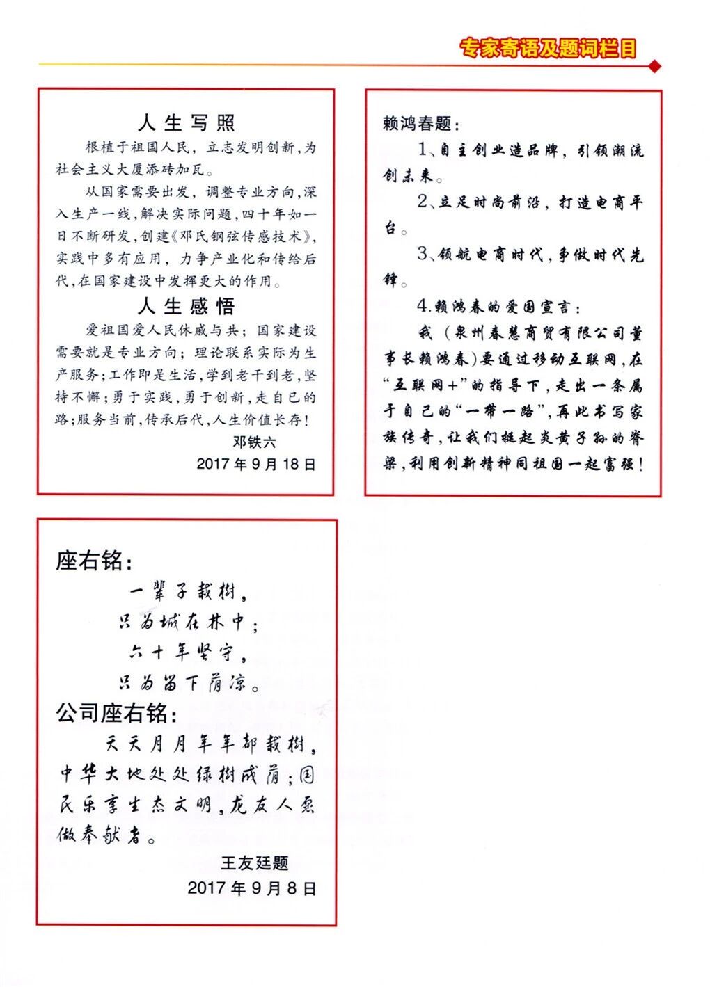 专家寄语及题词栏目发表寄语: