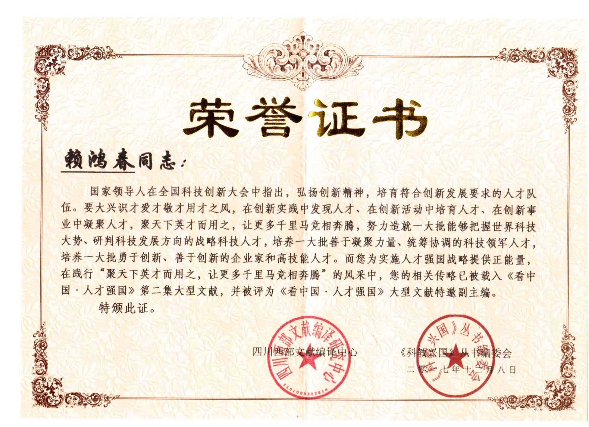 国家领导人在全国科技创新大会中指出,弘扬创新精神,培育符合创新发展要求的人才队伍。要大兴识才爱才敬才用才之风,在创新实践中发现人才、在创新活动中培育人才、在创新事业中凝聚人才,聚天下英才而用之,让更多千里马竞相奔腾,努力造就一大批能够把握世界科技大势、研判科技发展方向的战略科技人才,培养一大批善于凝聚力量、统筹协调的科技领军人才,培养一大批勇于创新、善于创新的企业家和高技能人才。而您为实施人才强国战略提供正能量,在践行“聚天下英才而用之,让更多千里马竞相奔腾”的风采中,您的相关传略已被载入《看中国。人才强国》第二集大型文献,并被评为《看中国。人才强国》大型文献特邀副主编。