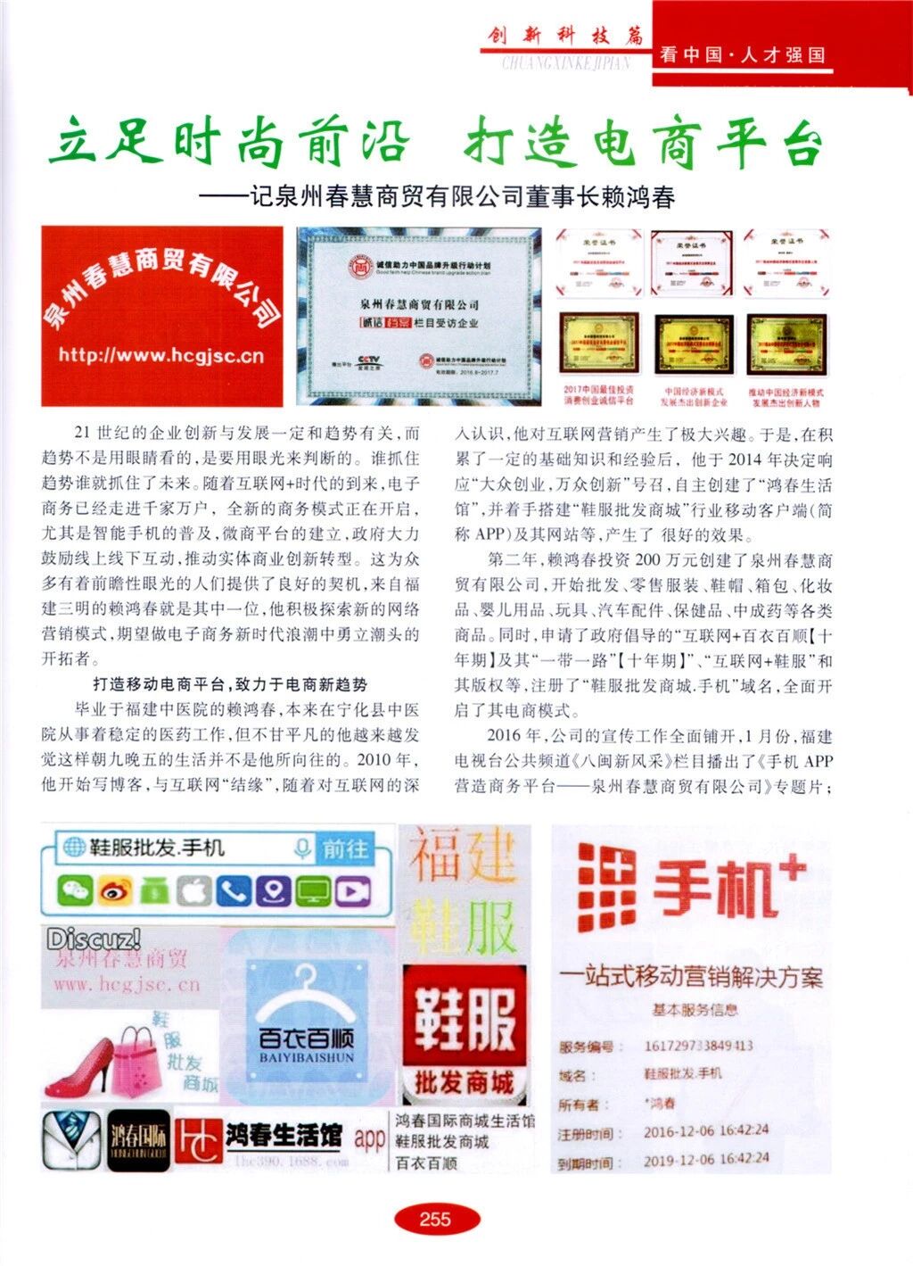 官宣!泉州春慧商贸有限公司挂牌前海股交中心(挂牌代码:366995 )、获得三大奖项、参加第11届全球创业周路演、载人《国际商报》、《海峡科技与产业》杂志、《科技与生活》、《看中国.人才强国》、《领航者》 。春慧商贸创始人赖鸿春荣登大型文献《中华崛起.人才强国》副主编并载入该典籍中--女人.手机38166.vrukou.cn 。