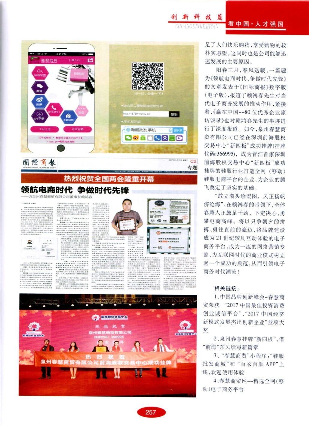 阳春三月,春风送暖,一篇题为《领航电商时代、争做时代先锋》的文章发表于《国际商报》数字版(电子版),报道了赖鸿春先生对当代电子商务发展的推动作用,紧接着,《赢在中国–80位优秀企业家访谈录》也对赖鸿春先生的事迹进行了深度报道。如今,泉州春慧商贸有限公司已经在深圳前海股权交易中心“新四板”成功挂牌(挂牌代码:366995),成为晋江首家深圳前海股权交易中心“新四板”成功挂牌的鞋服行业打造全网(移动)鞋服电商平台的企业,4月20日,公司上市挂牌敲锣仪式隆重举行,众多行业人士和知名媒体共同见证,同时,各大知名网站均已《泉州春慧挂牌‘新四板’ 借‘前海’东风续写新篇章》为题争先报道,春慧商贸从此进入高速发展的新阶段!