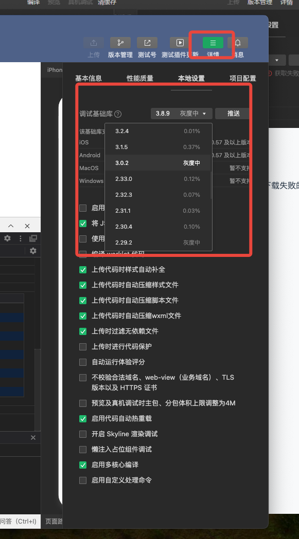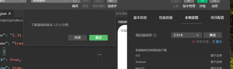 首先需要知道是,在开发者工具上,是可以切换不同版本基础库进行开发调试。大部分用户反馈的基础库下载失败的原因是,当前项目配置的开发调试的基础库版本已经被下架了或者不可用了。因此大家可以通过点击工具顶部栏的 详情->本地设置->调试基础库 看看自身基础库版本是否在列表中,如果不存在即可能是不可用了。需要切换使用