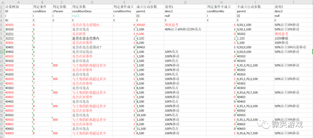 - 数据表的索引方式 对于简单的ai,可以一个敌人对应一个决策树ID;对于复杂的AI,可以一个敌人的一个动作对应一个决策树AI。所以这里抛出了一个问题,就是手动填写这样的表,维护成本也比较高了,所以这里对于复杂的AI需求,建议自己开发个小工具,这样用起来不易出错,且容易维护。