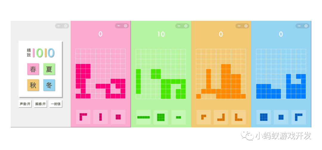 既然是要做一款微信小游戏,当然是先看一下微信小游戏平台上现在已有的“1010”类型的游戏都是什么样子?在试玩了所有的1010类型的游戏后,我有了这样的想法:这里所有的1010都无法让我满意,都不够精致,看来我必须而且一定要自己做一个了。一个极其自恋但是对我来说却有着极大动力的想法。