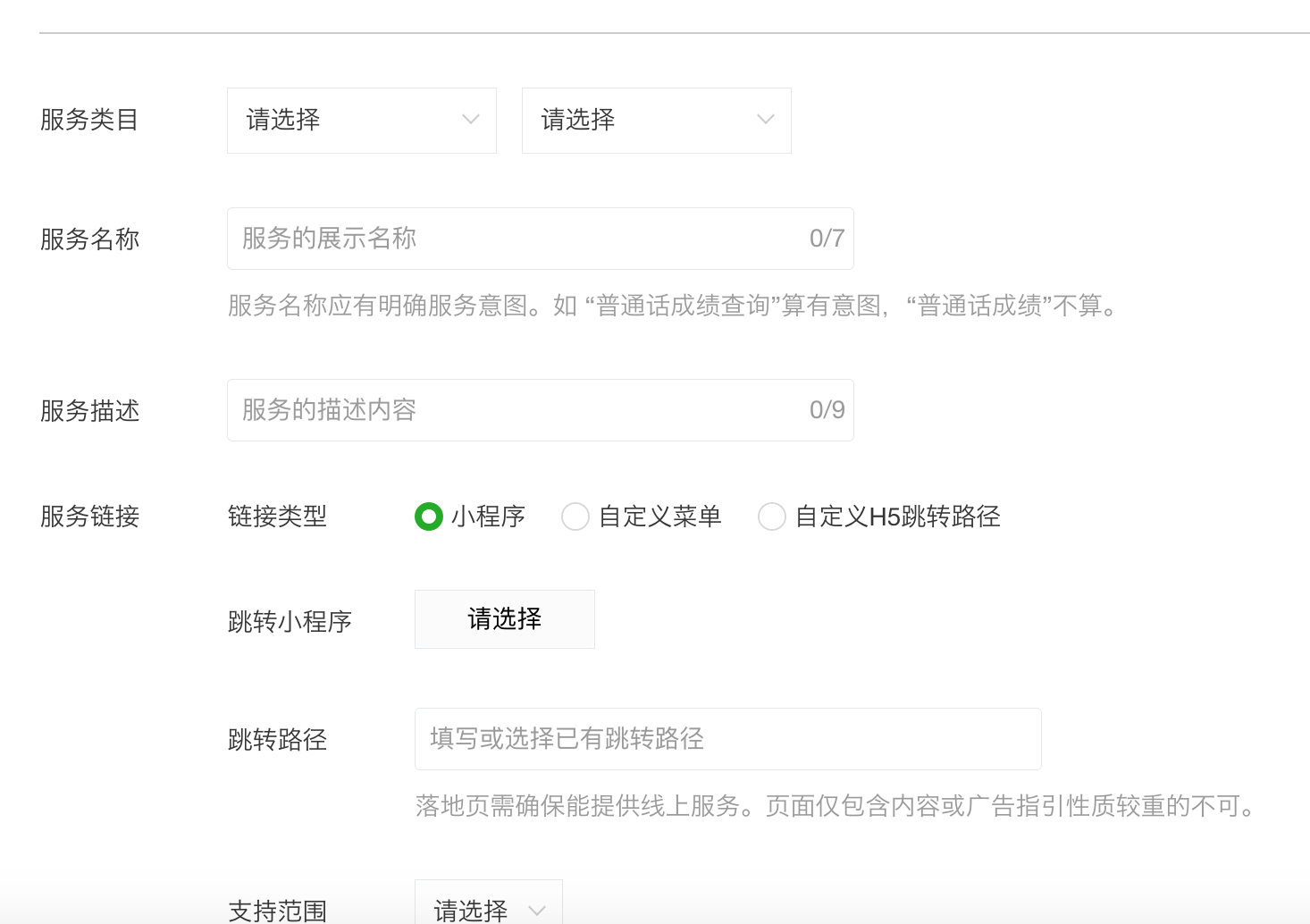 4-6、落地页不能聚集服务,必须单服务和服务名称对应(同一个小程序多种服务,可多次提交不同页面)