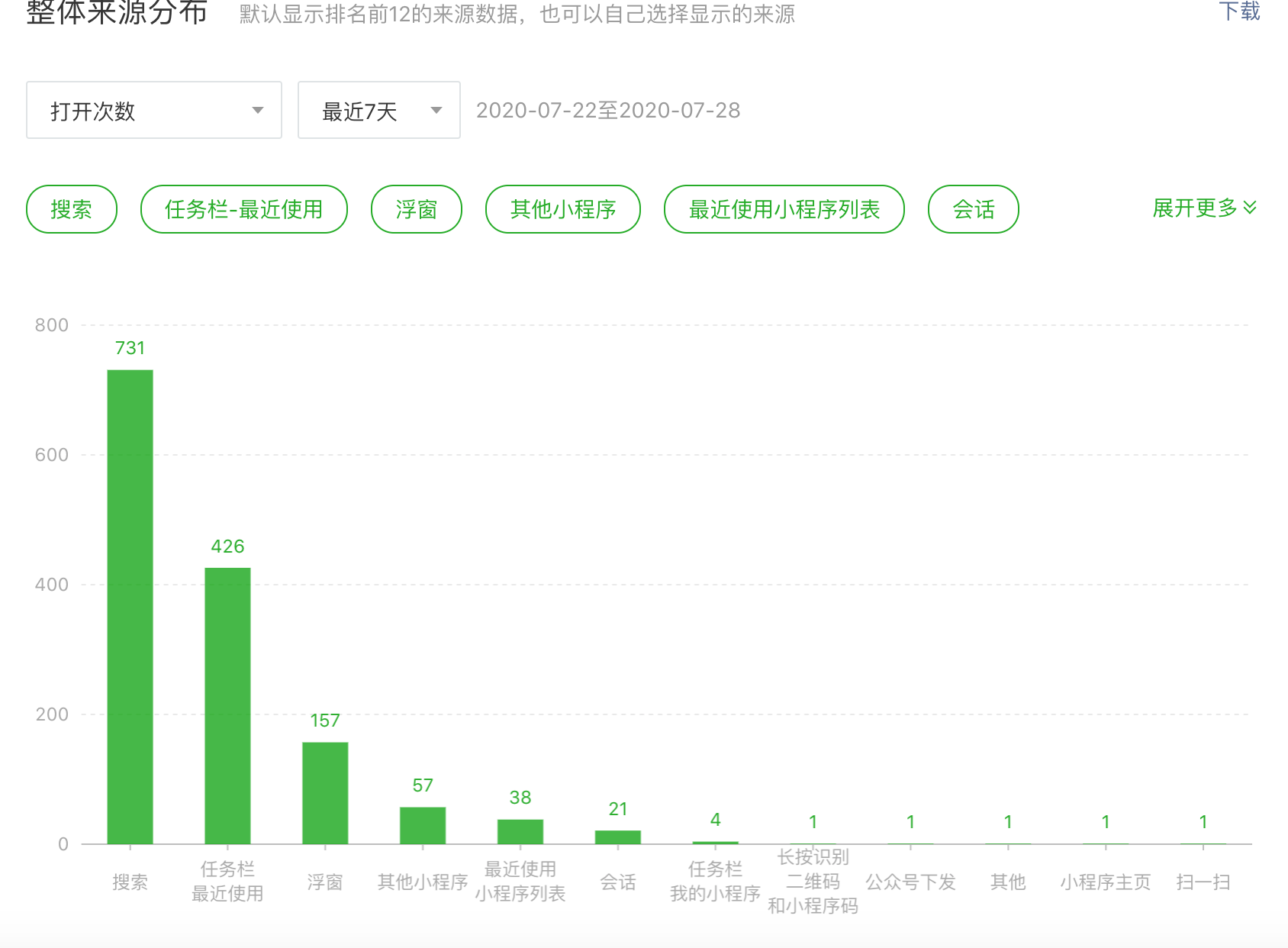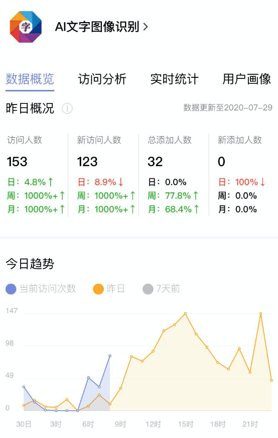 我有一个小程序本来是要放弃的,名字起的一般,搜索量没有,每天用户不到10人,都准备注销了。但是开通服务后每天至少能达到100多人。下面是最近一周详细数据。
