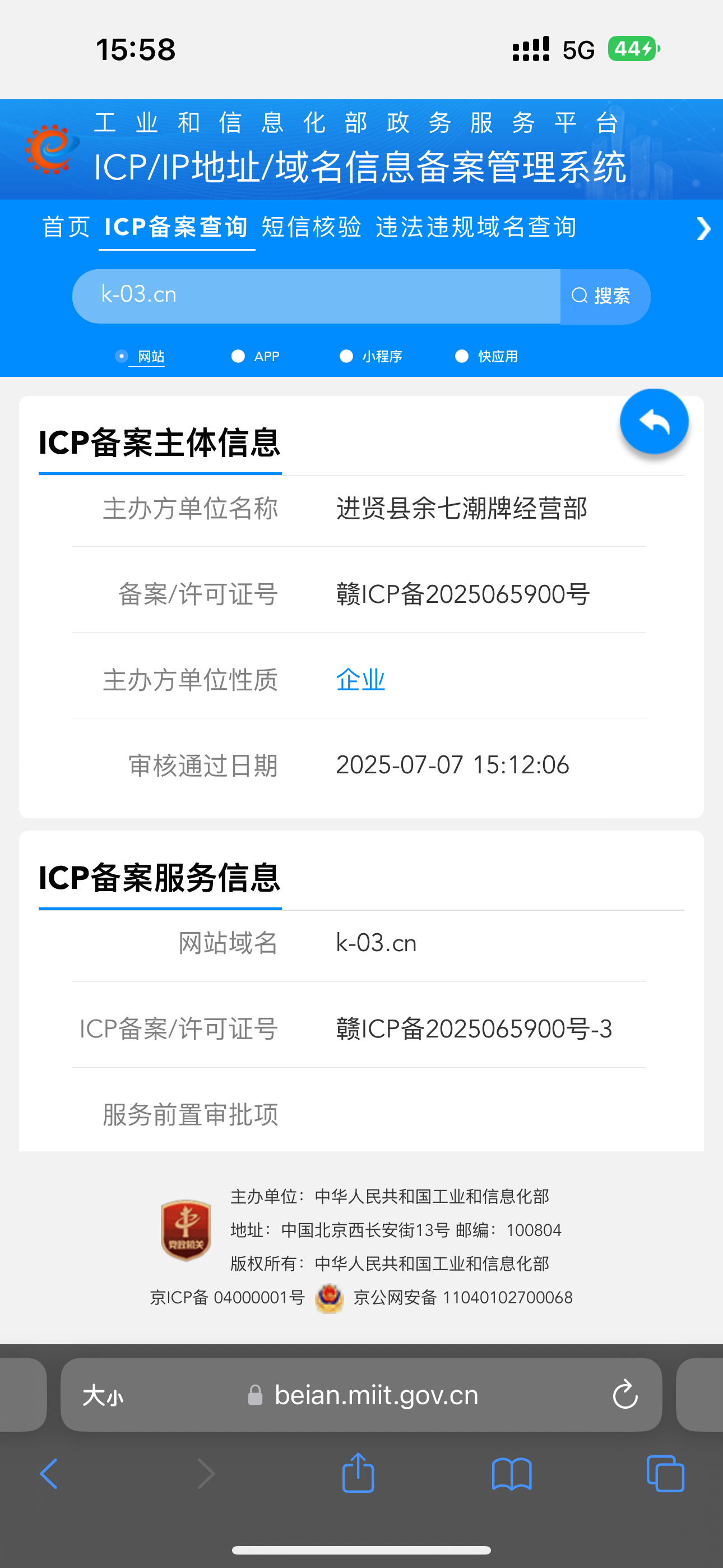 您好!我的网站(k-03.cn)已完成工信部域名备案(备案号:赣ICP备2025065900号-3),内容及服务均严格遵守法律法规,无违法违规、低俗色情等不良信息。