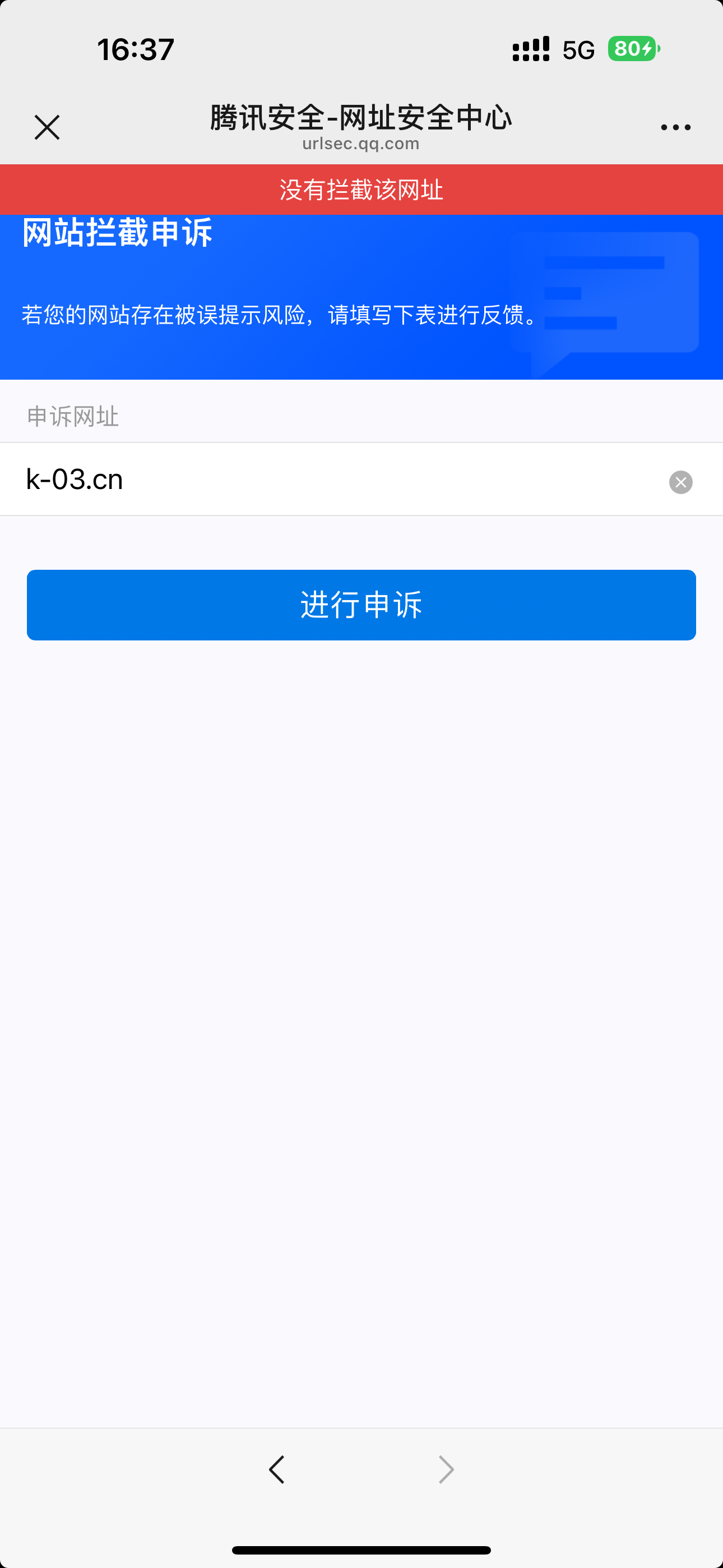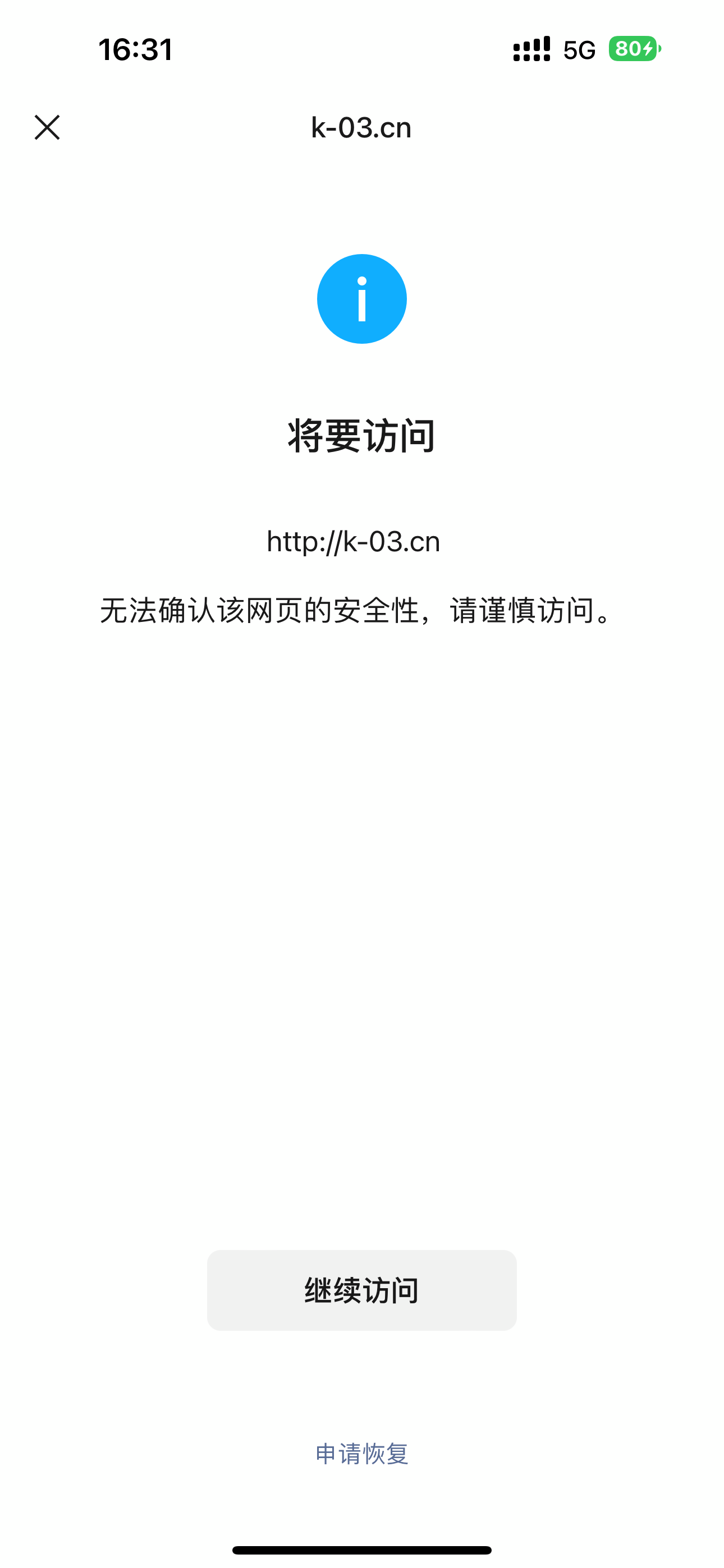 该链接在微信内被限制直接访问,提示“无法确认该网页的安全性,请谨慎访问”经自查,网站运营合规,无任何风险问题,推测为系统误判。腾讯安全网址安全中心检测网页没有不安全的内容。恳请重新审核评估,解除微信访问限制,恢复正常访问功能,感谢!您好!我的网站(k-03.cn)已完成工信部域名备案(备案号:赣ICP备2025065900号-3),内容及服务均严格遵守法律法规,无违法违规、低俗色情等不良信息。