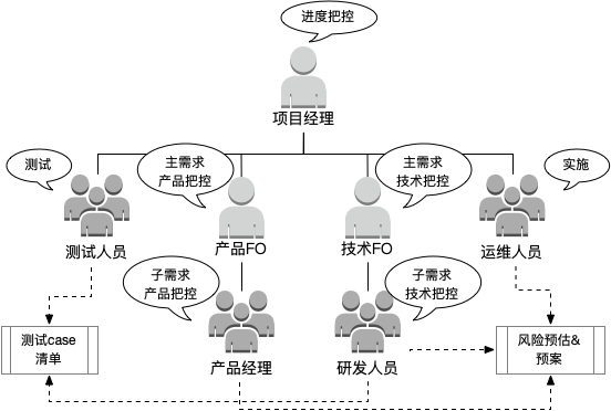 - 技术FO:同产品FO的角色类似,技术FO把控主需求,每个子需求由指定的研发人员负责。技术FO也同样由负责某个子需求的研发人员兼顾;