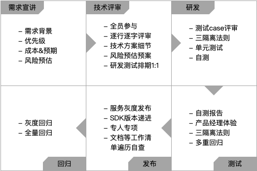 在整体流程上,云开发与其他大多数研发团队并没有太大区别,一次迭代流程依次经过评审、研发、测试和发布。品控意识体现在细节把控上。