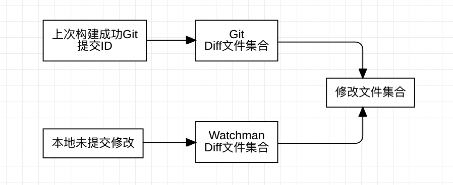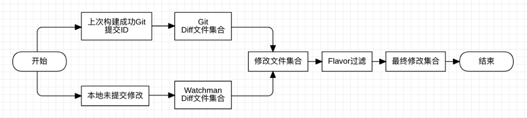 Watchman 似乎可以替代 Git 完成改动获取的工作,但在实践中我们又发现了新的问题:在多分支切换的情况下面,从 A 分支切换到 B 分支,然后再从 B 分支切换回来,没有修改一行代码,但 Watchman 会产生 A,B 之间差异文件的改动记录,此时 Watchman 的 diff 集合是不准确的,但 Git 就可以得出正确的修改记录,于是,结合两个工具的优势,得出获取改动的逻辑流程: