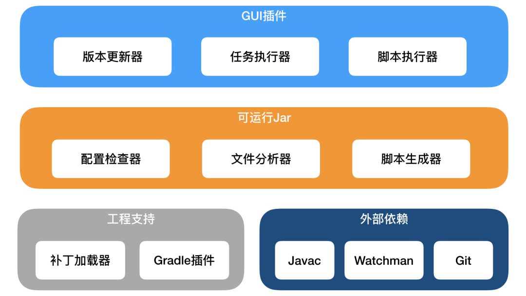 - 工程支持部分:一个 Gradle 插件,完成对工程信息的获取和产物加载代码的插入