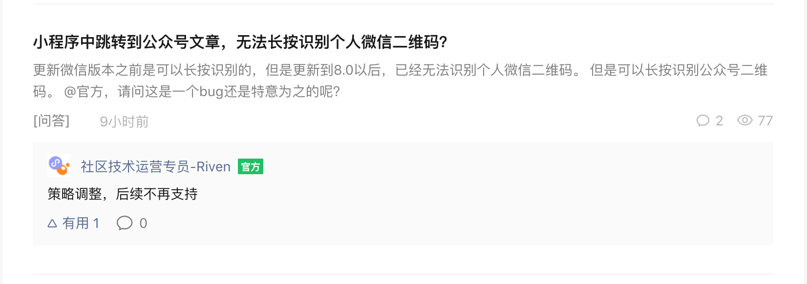 后面随着某版本微信策略调整,是允许小程序内嵌公众号文章内长按识别二维码,但是随着微信8.0的发布,这个策略又被收紧了,具体见下图官方回复