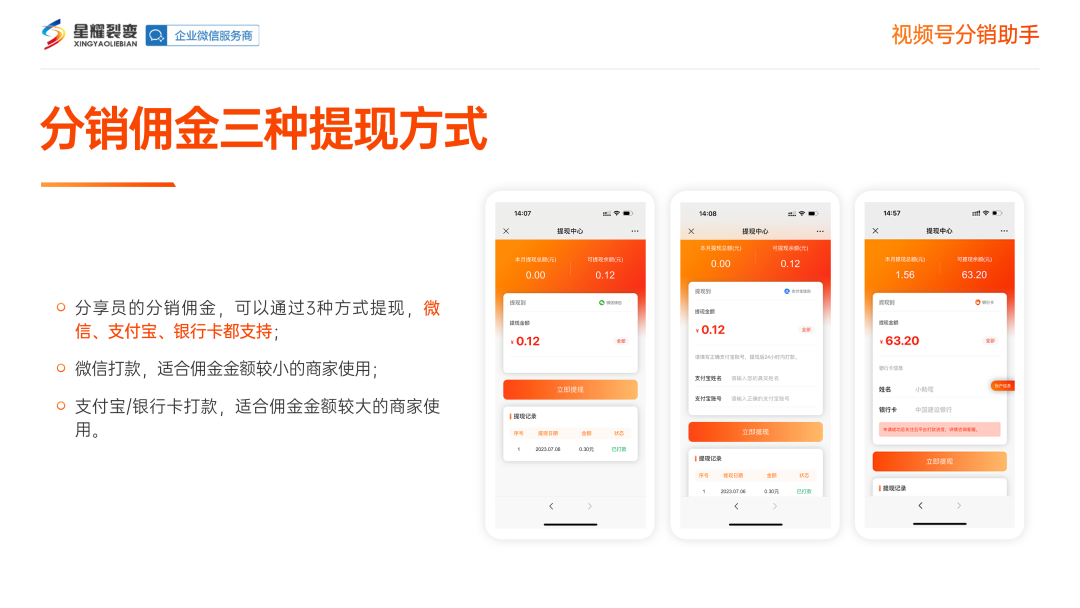 佣金可以打款至分享员的支付宝/微信钱包/银行卡。