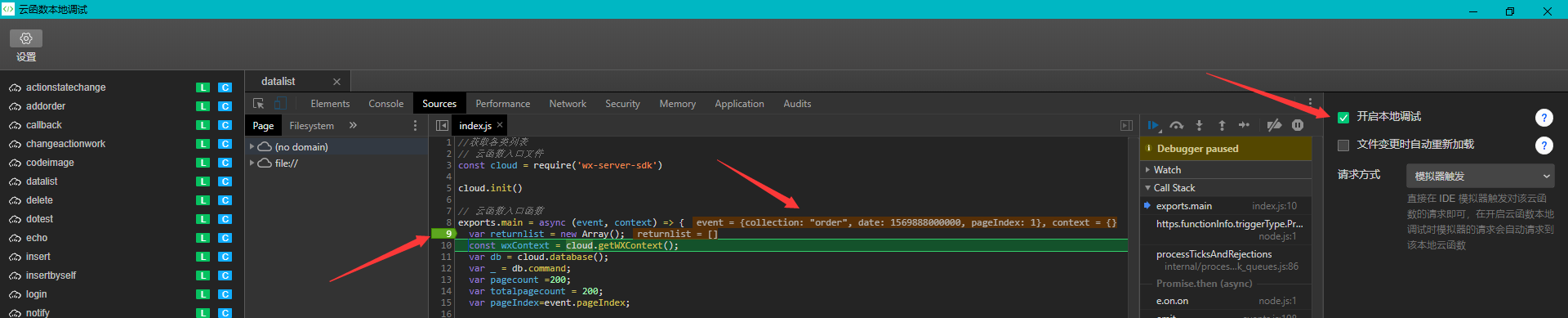 当然,你也可以使用云函数的本地调试功能(来自Littlesnail大佬的分享),但是本地环境是缺少wx-server-sdk这个包的,需要自己用npm装,大家可以自行衡量。