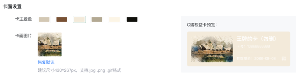 会员权益卡接入该功能后,当用户上传完卡面图片,便会自动提取其中的主题色。这样,用户可以直接选择提取出的色彩作为主题色应用,以确保卡面图片和主题色的协调性。具体效果如下所示: