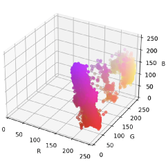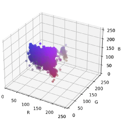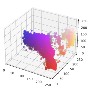 某图像颜色在三维空间中的分布示意,可以看到部分区域的像素点非常密集