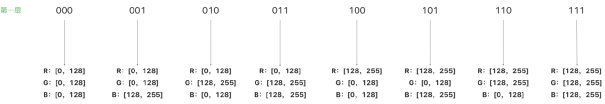 与二分查找法类似,我们需要将像素的RGB值分别与其轴中点进行比较并将结果用0、1来表示(0-小于中点,1-大于中点),在第一层中得到的对应关系如下图所示。