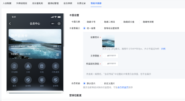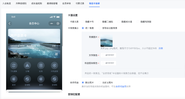 并且每⼀套等级/权益卡的卡面外观,包含了勋章图案、卡面背景、自定义图片、⽂字颜色和背景配色,商户可以对其进行自定义搭配用以塑造界面的整体氛围和风格,提升整体的视觉体验。