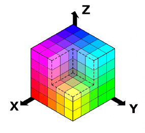 中位切分其实非常好理解。首先需要各位读者发挥下空间想象能力,将R、G、B想象成三维空间的X、Y、Z轴,这样我们就得到了一个边长为256的立方体盒子,接着把每个像素点当作一个无体积的小球根据其坐标(r,g,b)放入盒子中。
