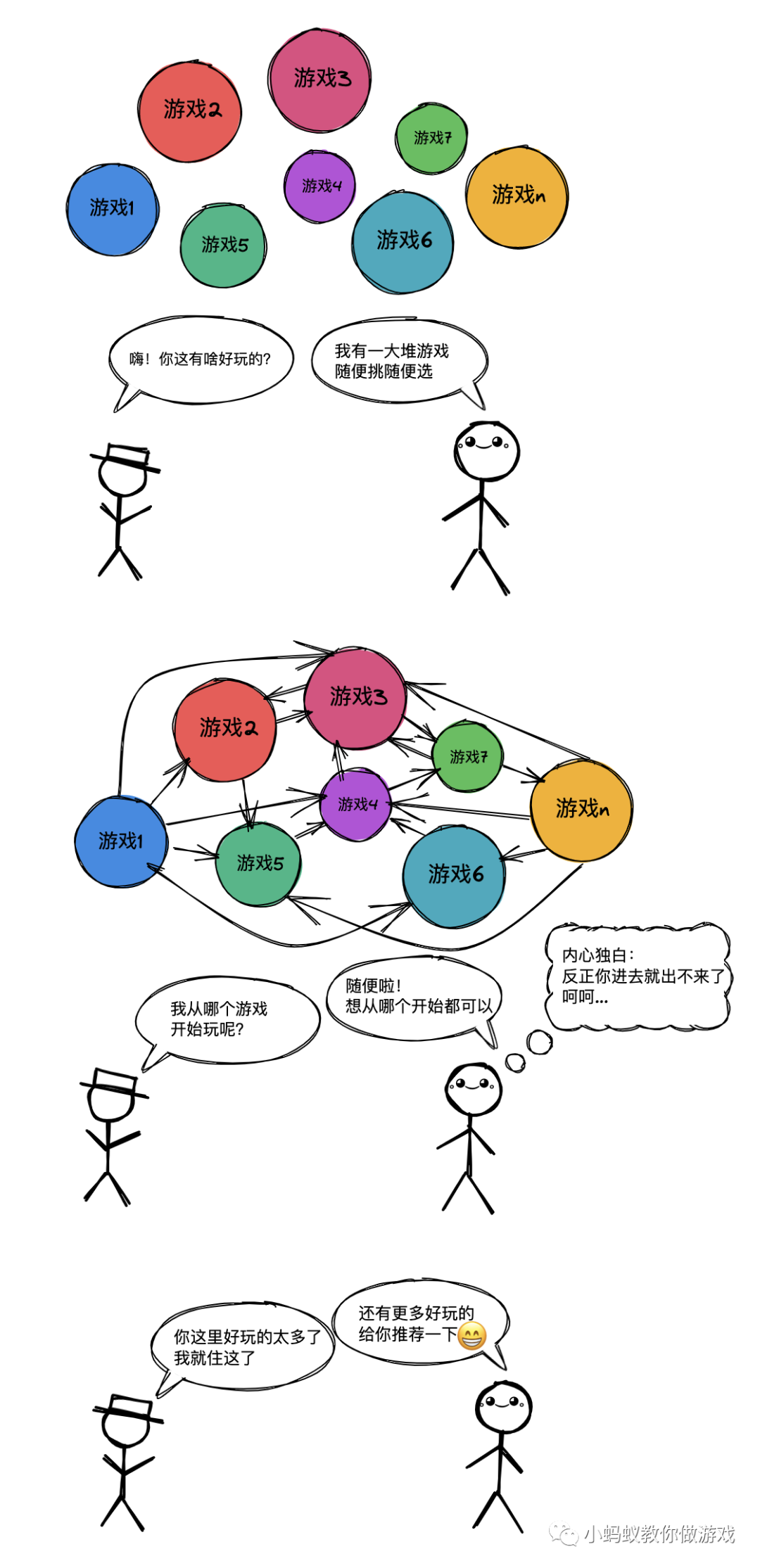 这一大堆的小游戏,就叫做矩阵,它们之间是互相联通的,不论玩家从哪个游戏进来,都有可能通过其中的通道进入你的下一个游戏,下一个游戏,再下一个游戏......