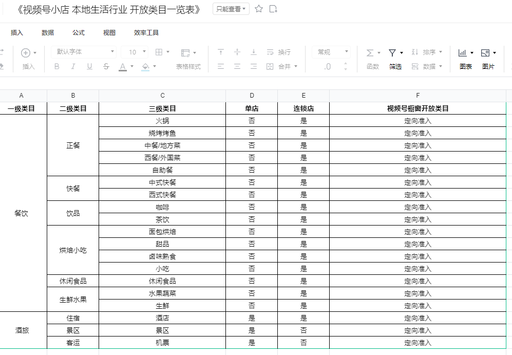 视频号已开放2个类目,分别是餐饮和酒旅,餐饮包括正餐、快餐、饮品、烘焙小吃、休闲食品、生鲜水果,只允许连锁店入驻。