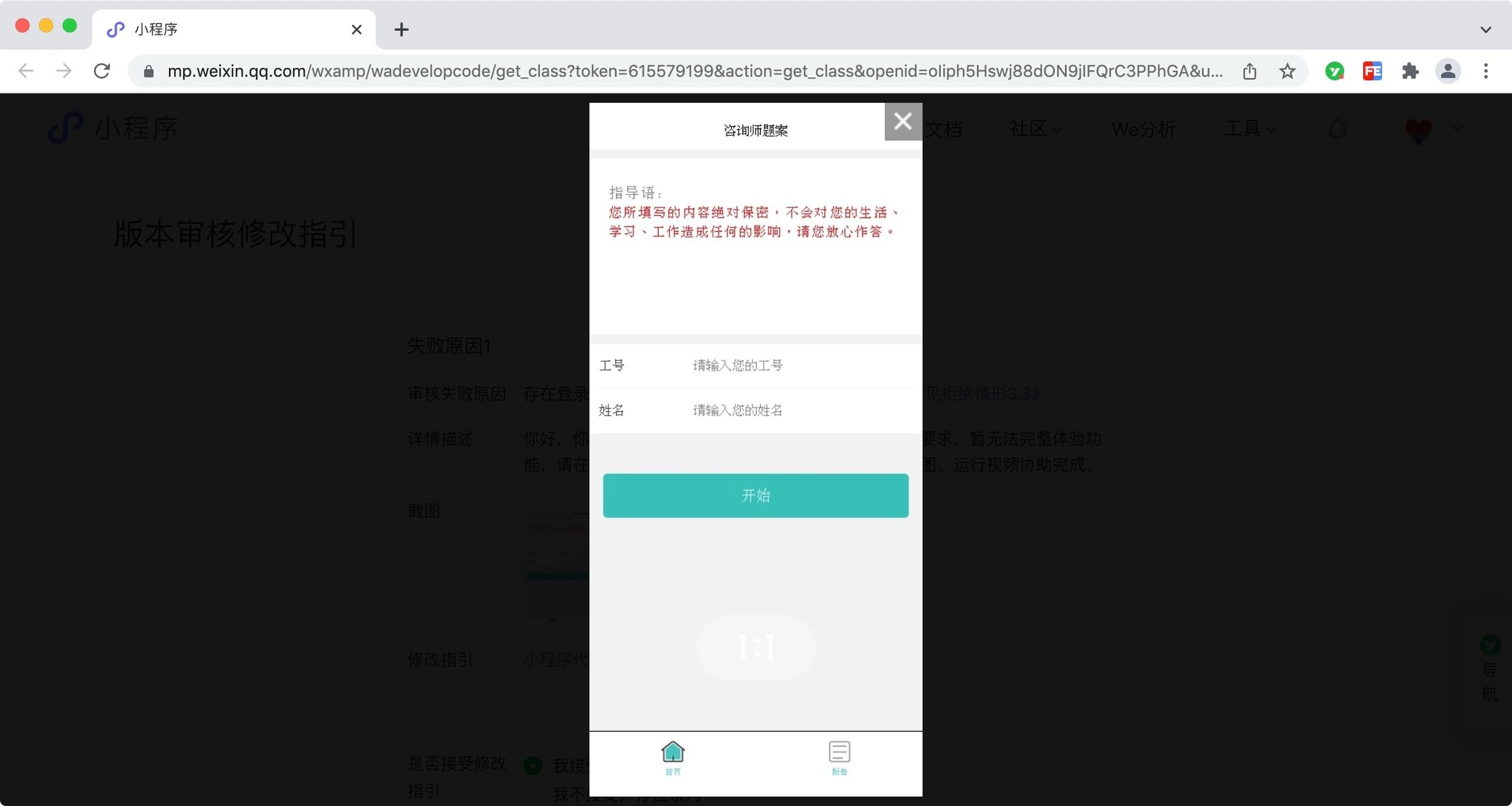 这是我开发的一款介于问卷和答题之间的小程序,更偏向于问卷,在提交的时候由于没有备注好姓名和工号,导致审核被拒