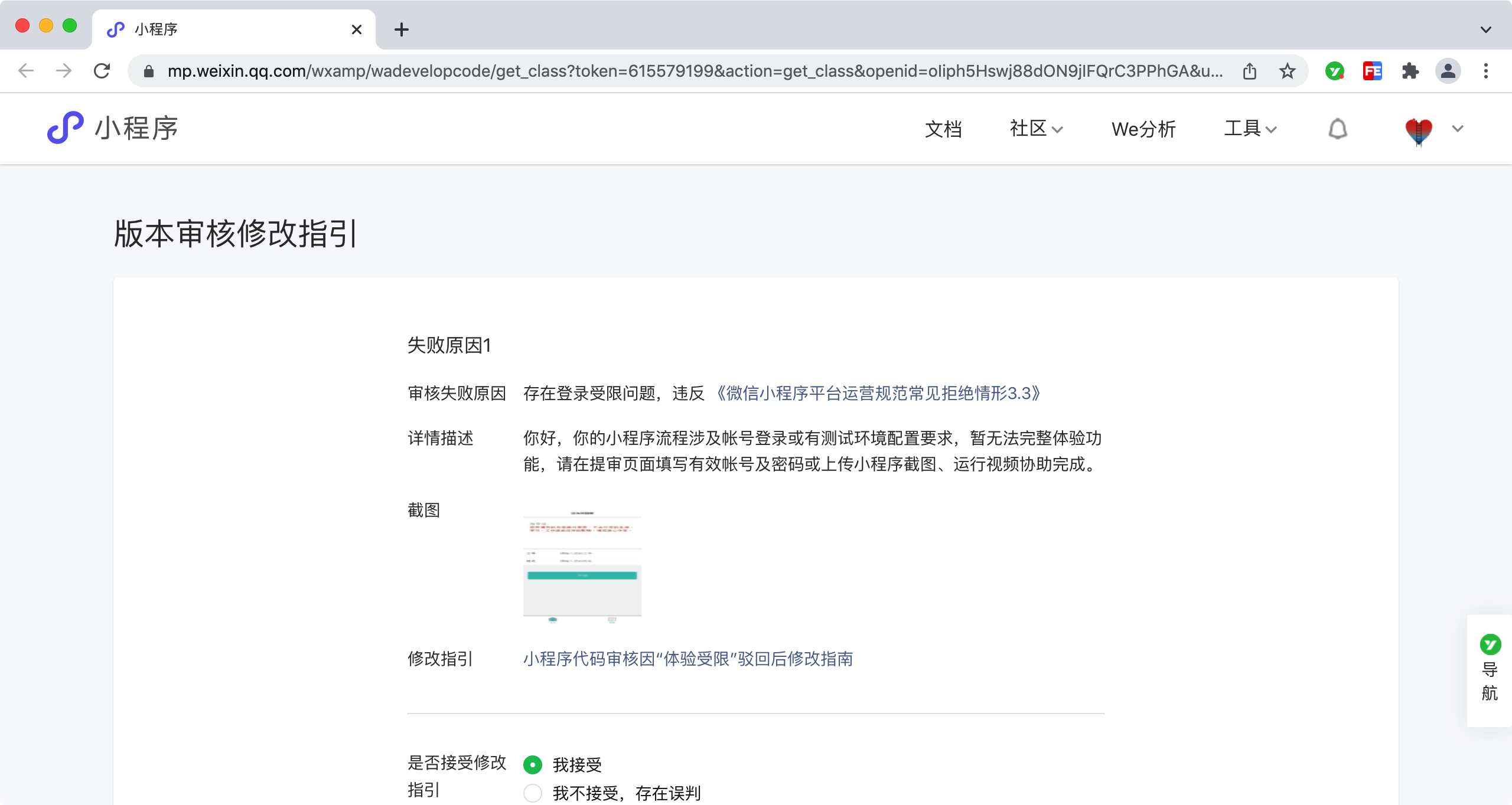 这已经是这个小程序第二次被拒了,具体被拒的原因如下图所示