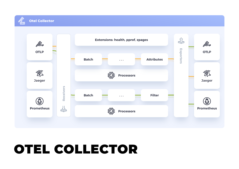 收集器用于收集、处理和导出遥测数据。它主要充当一个与供应商无关的代理。虽然它不是一个必不可少的组件,但由于它对于接收和发送应用遥测数据到后端具有很大的灵活性,所以其还是很有帮助的。举个例子,如果必须,你可以处理来此OTLP(opentelemetry本身提供的数据格式)、Jaeger及Prometheus的多种数据格式,并将其发送到各种后端应用。