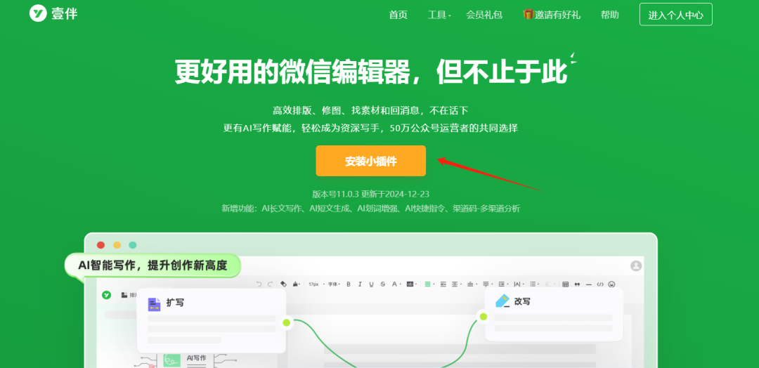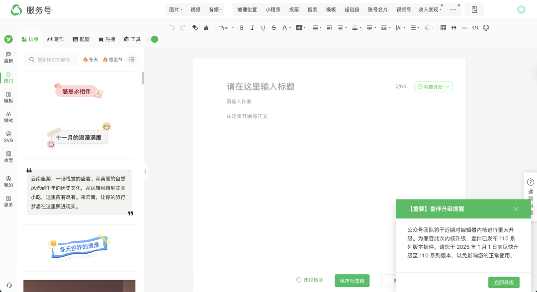 同时,为了保证您的使用体验,对于还没有升级插件的用户,我们会在微信文章编辑页右下角进行升级提示。