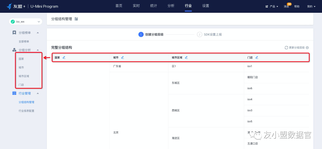 此功能适用于有层级结构业务小程序,按照各层级进行数据统计,查看自定义指标、属性、来源的数据。例如连锁门店类一个小程序内有多门店的场景: