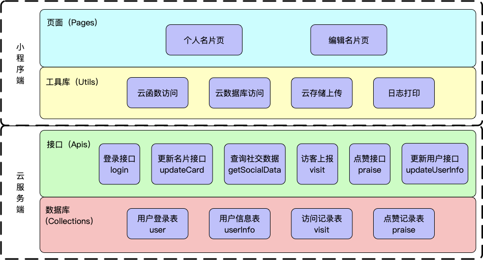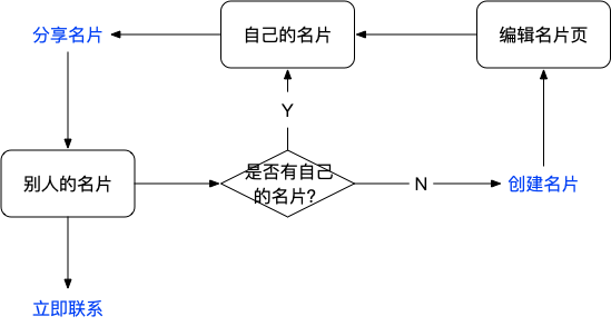 1、页面(Pages):最上层是用户界面。只需要两个页面即可完成全部业务需求,别人的名片和自己的名片共用【个人名片页】,根据传入的cardId做区分。