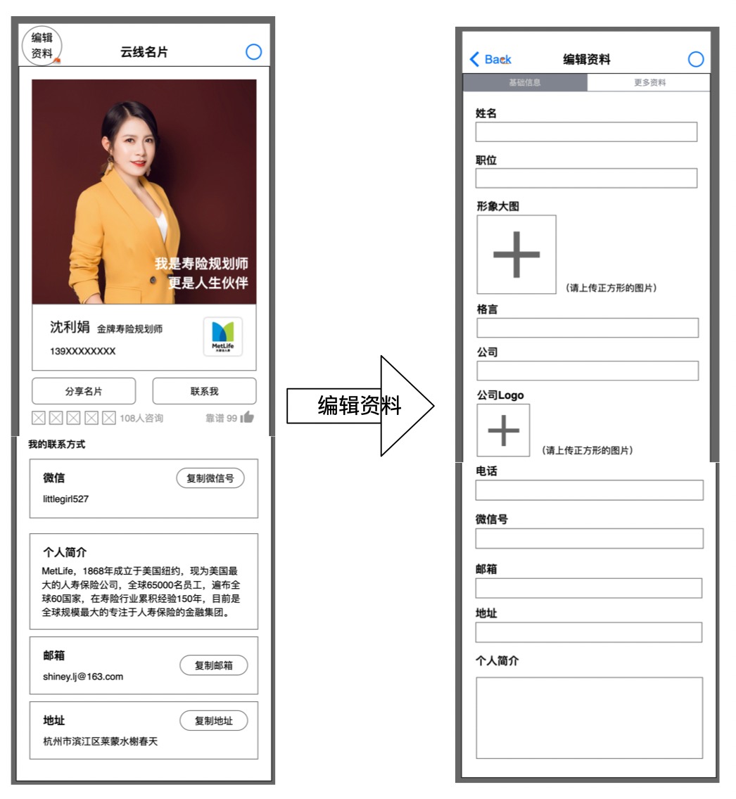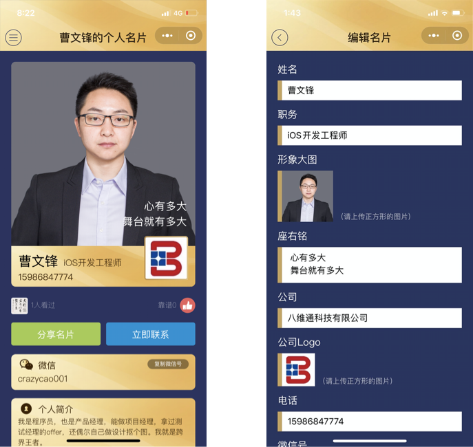 编辑完成并保存提交后,可以将自己的名片再分享给朋友,完成名片交换。