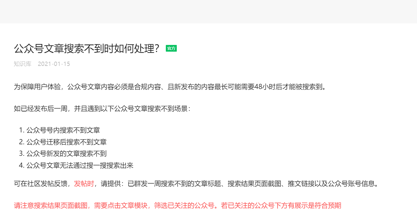 公众号发文,不管用关键词还是标题精准搜索都搜不到文章,望官方给解决一下。