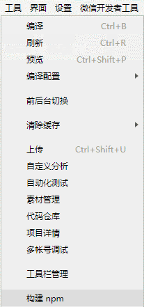 点击开发者工具中的菜单栏:工具 --> 构建 npm