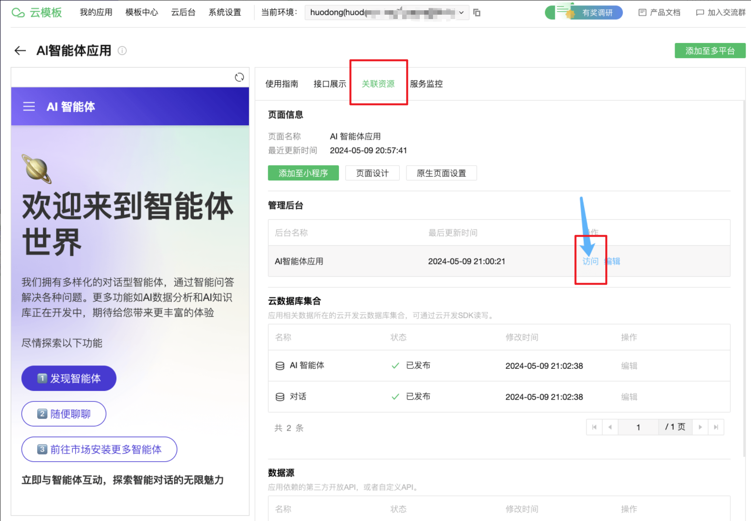 5.安装成功后切换到「关联资源」菜单「访问」管理后台