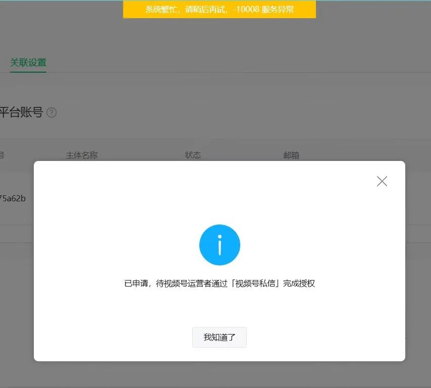 您好,我司小程序(AppID:wx3a8c75d5b922a88e为企业主体,已开通「微短剧」类目并上线,且接入官方短剧播放器(wx94a6522b1d640c3b),播放器PV占比达标。我在小程序后台「设置 → 关联设置 → 关联视频号」中,发起了对同主体视频号(微信号:daiqun_911019)的关联申请,系统提示「已申请,待视频号运营者通过「视频号私信」完成授权」。视频号管理员已在微信服务通知中确认同意授权,但返回小程序后台后,页面持续提示「系统繁忙,请稍后再试,-10008 服务异常」,无法完成关联状态同步。