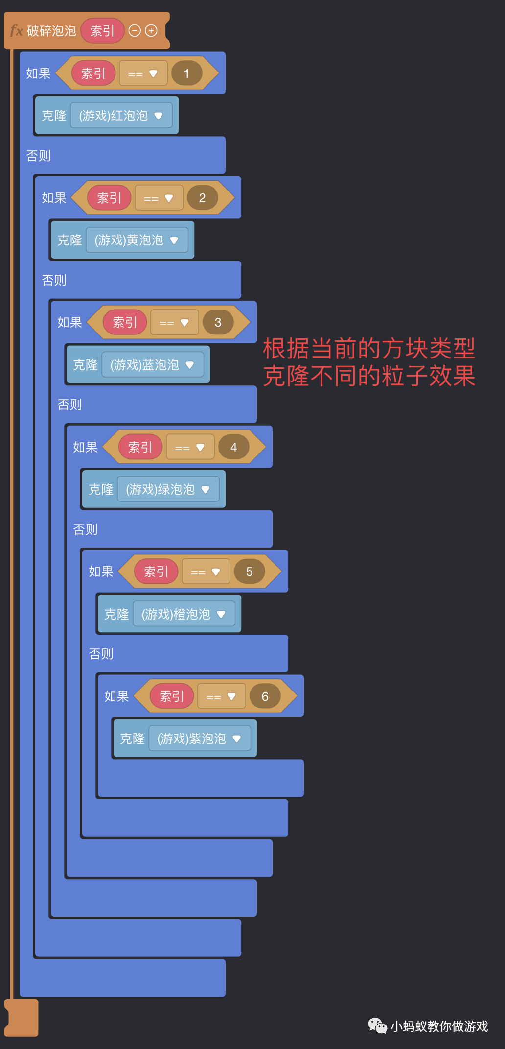 最后看一下粒子的创建,这里使用了一个函数,这个函数会在方块移除的时候调用,根据方块的类型,克隆不同的粒子效果。
