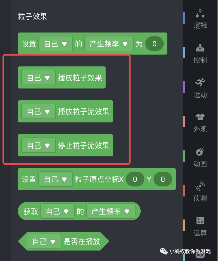 除了属性之外,对应的还会增加一些与粒子有关的积木块。