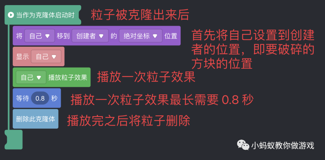 在需要使用粒子时,这里我用的方式是克隆一个新的粒子,因为游戏中的方块数量很多,想提前创建好的话,需要创建大量的粒子,所以使用了在需要的时候进行克隆这样的方式。逻辑很简单,克隆出来之后把自己放在创建者的位置,然后播放一次效果,最后把自己删除。