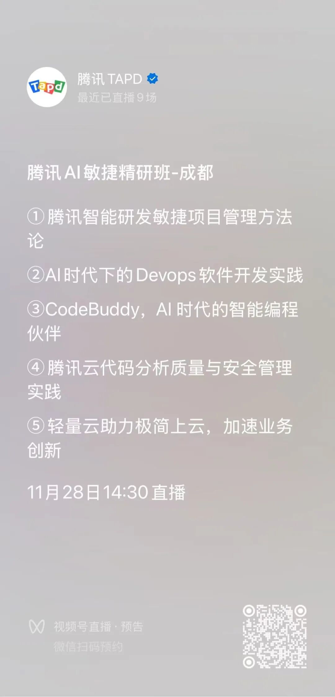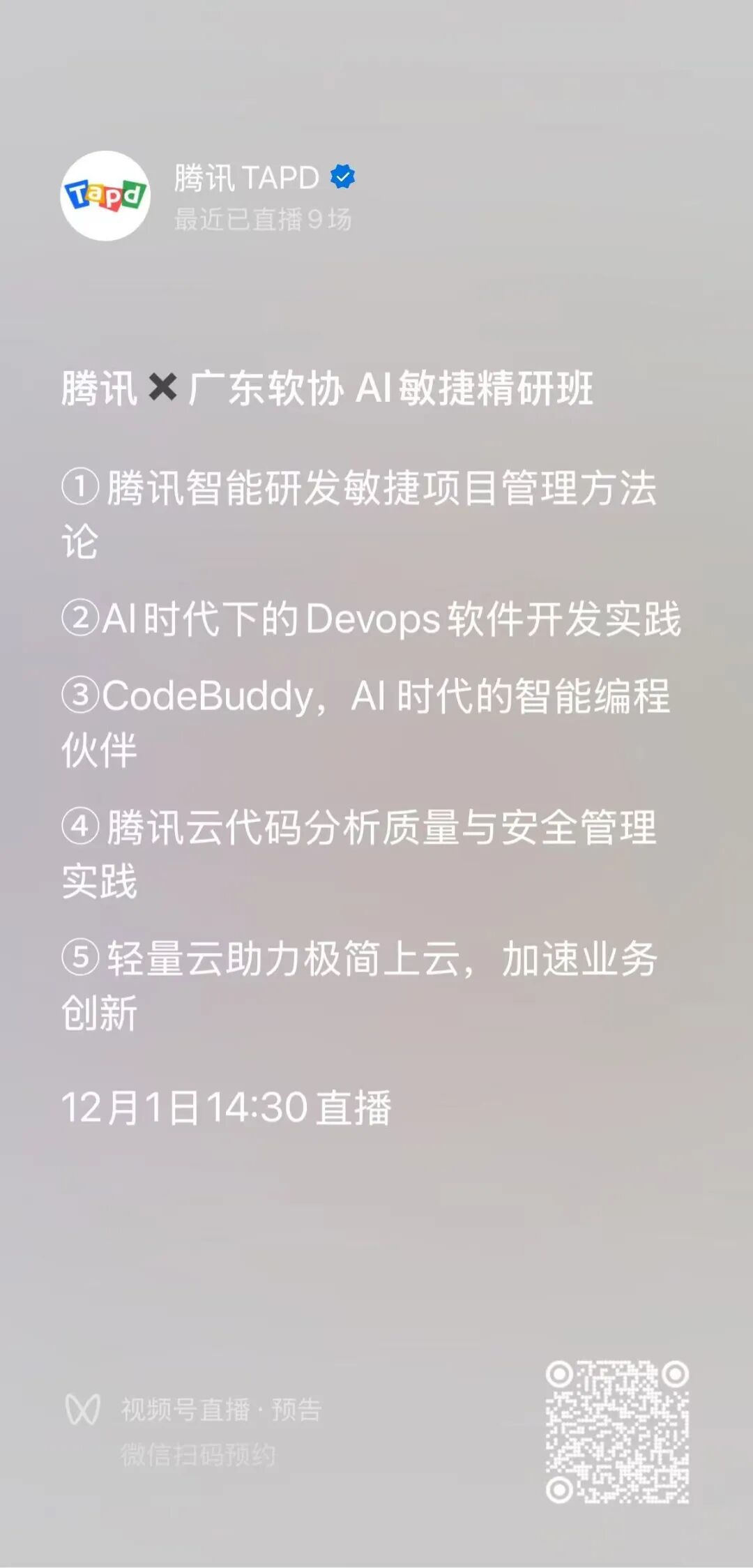 (TAPD×CNB×CodeBuddy×TCA×Lighthouse)联合广东软件行业协会发起 “走进腾讯 ——AI 敏捷研发精研班” 系列沙龙第二期,于2025年11月22日西安站、11月28日成都站、12月1日广州站重磅开启!