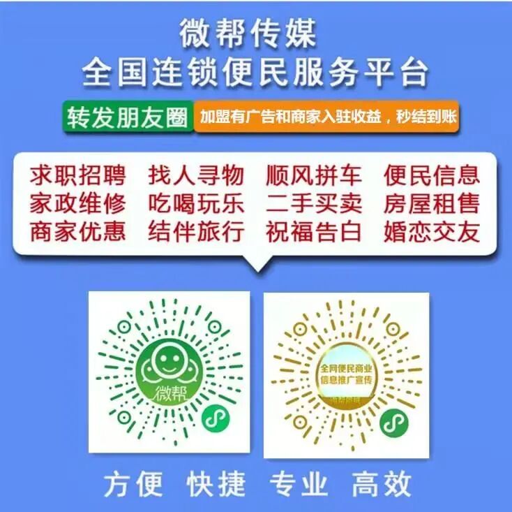 微帮同城平台致力于为全国各地人们提供优质服务如:“吃喝玩乐,衣食住行”便民信息分类: