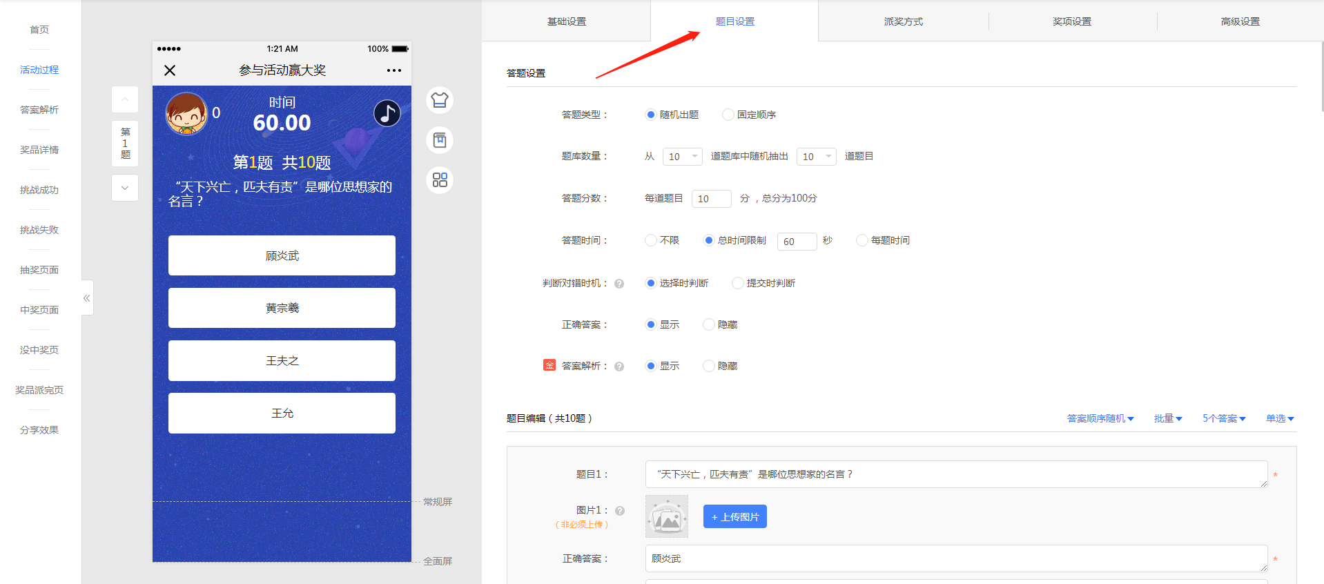 “题目设置”里可以设置答题游戏的出题方式,和支持自定义编辑题目,那些答题活动中有趣的问题都是可以这样自定义编辑出来的。