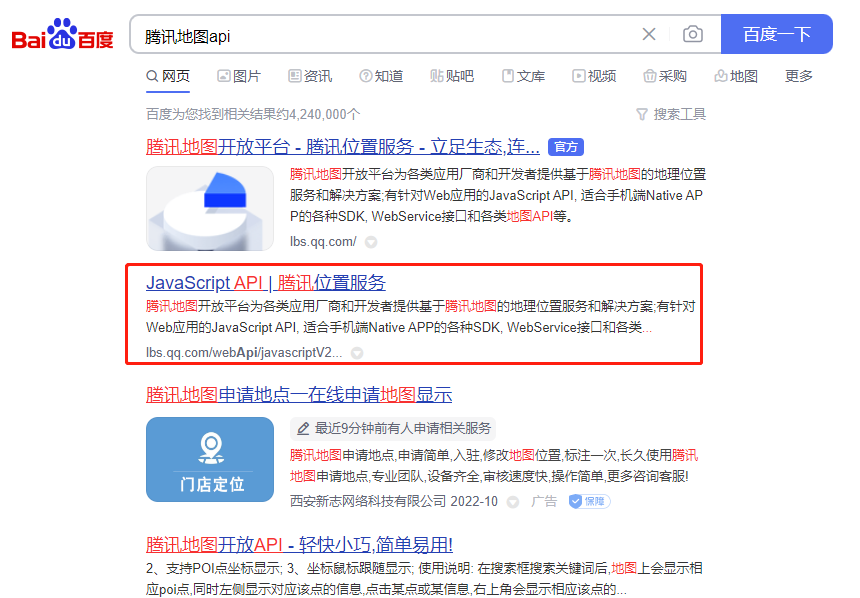 初始化经纬度为0时会加载不出来地图,页面会显示空白;为了预览一下地图效果咱们先打开百度搜索"腾讯地图API";