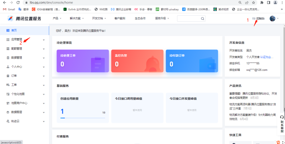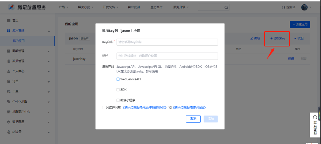 - 申请腾讯接口key,注册登录后先点击控制台,其次点击应用管理,到我的应用菜单。如下图: