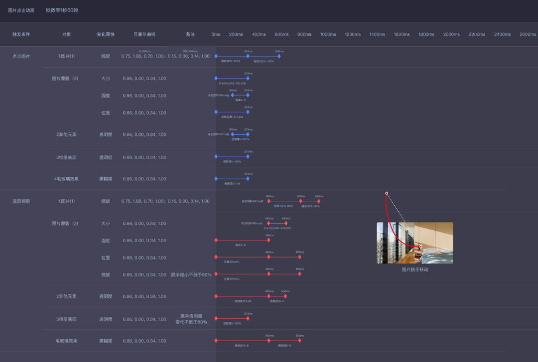 (2)在交互结束时,图片退回相册列表页原始位置,在返回路径的过程中,根据交互结束时的定位点,来判断运动的方向和距离,计算运动加速度,以及模拟运动加速度带来的惯性回弹的方向和角度变化,加强与模拟真实物理世界的运动定律,和视觉上的动态感知。