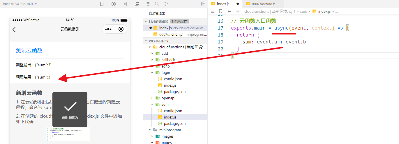如题,在学习云开发示例的过程中,一步步按照官方示例操作,但发现调用云函数sum时返回的结果不是期望值3,而是null,为此困扰很久。