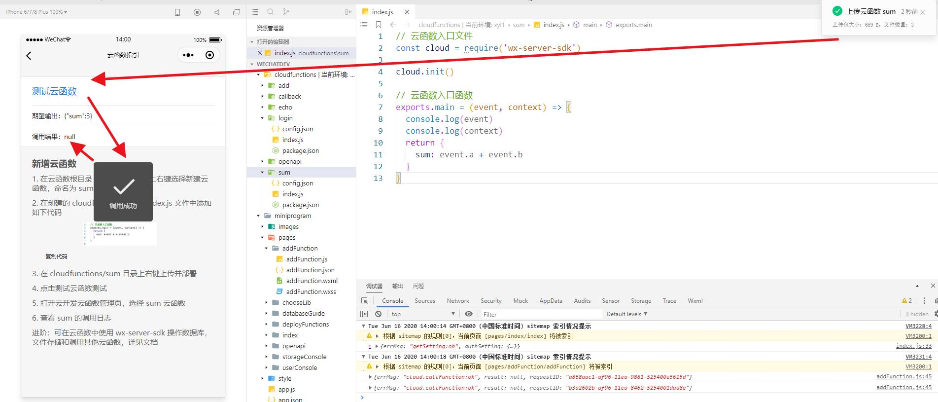 按照示例里的1-6步操作的,创建云函数文件、复制代码、粘贴代码、上传并部署,再点调用,返回null,一气呵成。如下图。