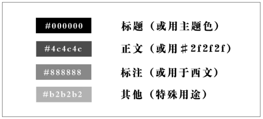 整篇文章的字体颜色尽量不要超过3种:一般是黑色(正文:#4c4c4c或者#3e3e3e)+ 灰色(标注:#888888)+ 品牌色;需要注意的是,品牌色饱和度尽量不要过高,最好慎重选择,毕竟是代表企业文化形象,也不要随意更换;
